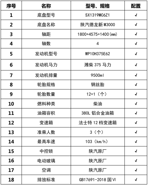 僅用軸距(mm):1800+3775+1400,1800+3975+1400,1800+4575+1400,該車為路面同步碎石封層專用車輛,主要專用裝置為瀝青罐,碎石箱及灑布系統(tǒng).側(cè)防護材料鋁合金,采用螺栓連接,后防護為專用裝置代替,下緣離地高450mm,ABS系統(tǒng)生產(chǎn)廠家及型號分別為:西安正昌電子股份有限公司(ZQFB-V);后部照明燈僅在駐車狀態(tài)下使用,起夜間照明作用,行駛過程中不可點亮。隨底盤選裝駕駛室。